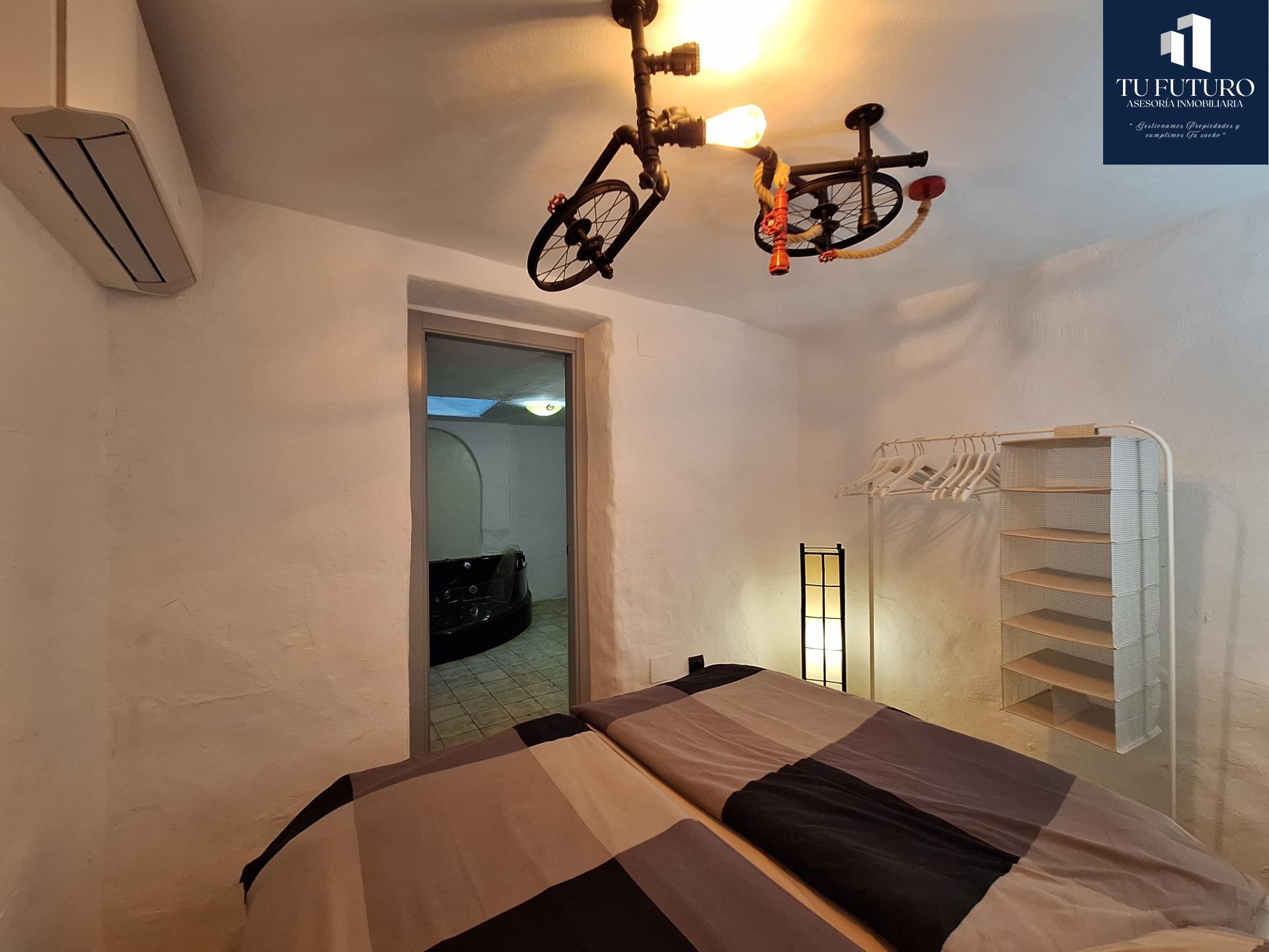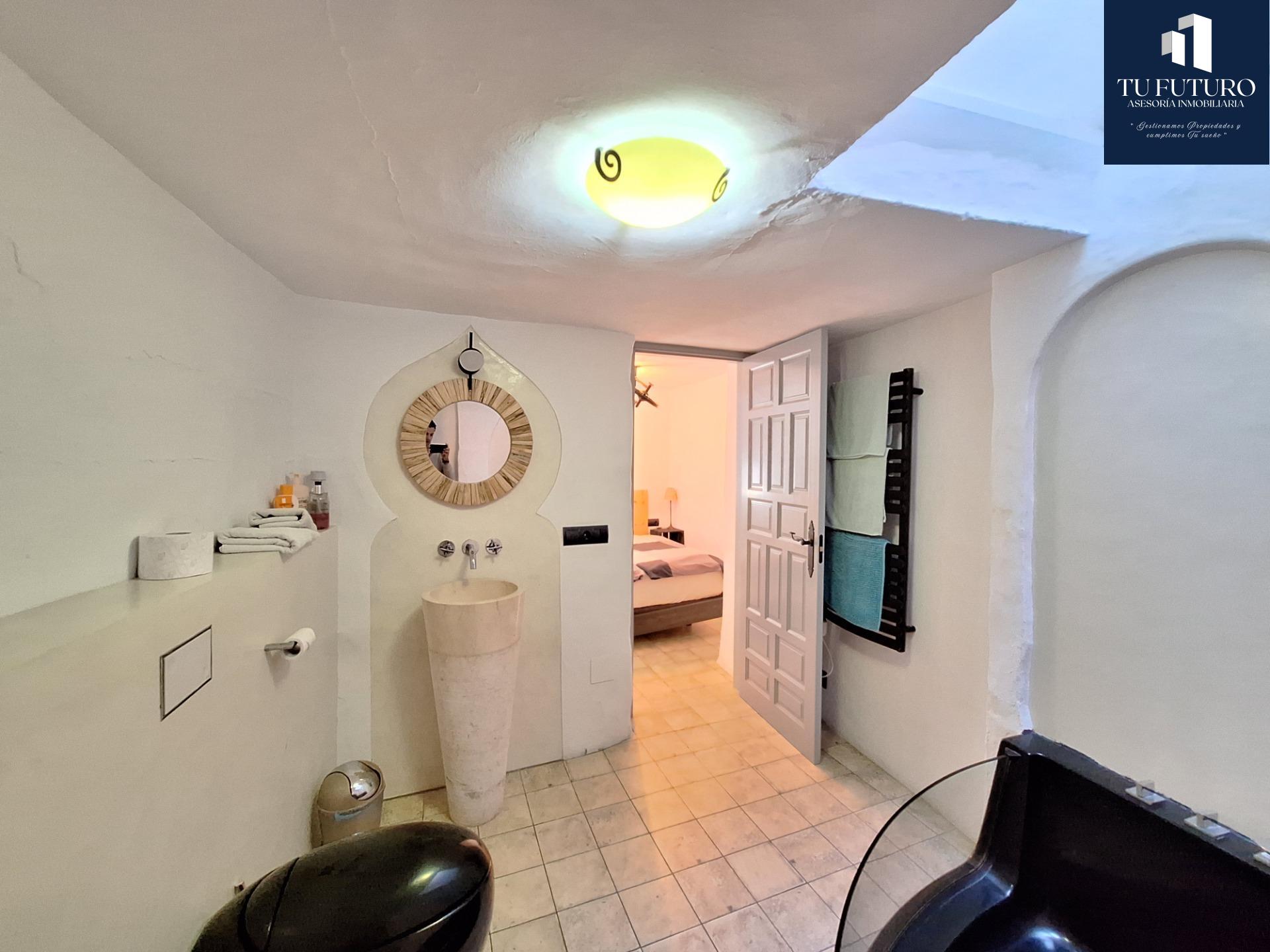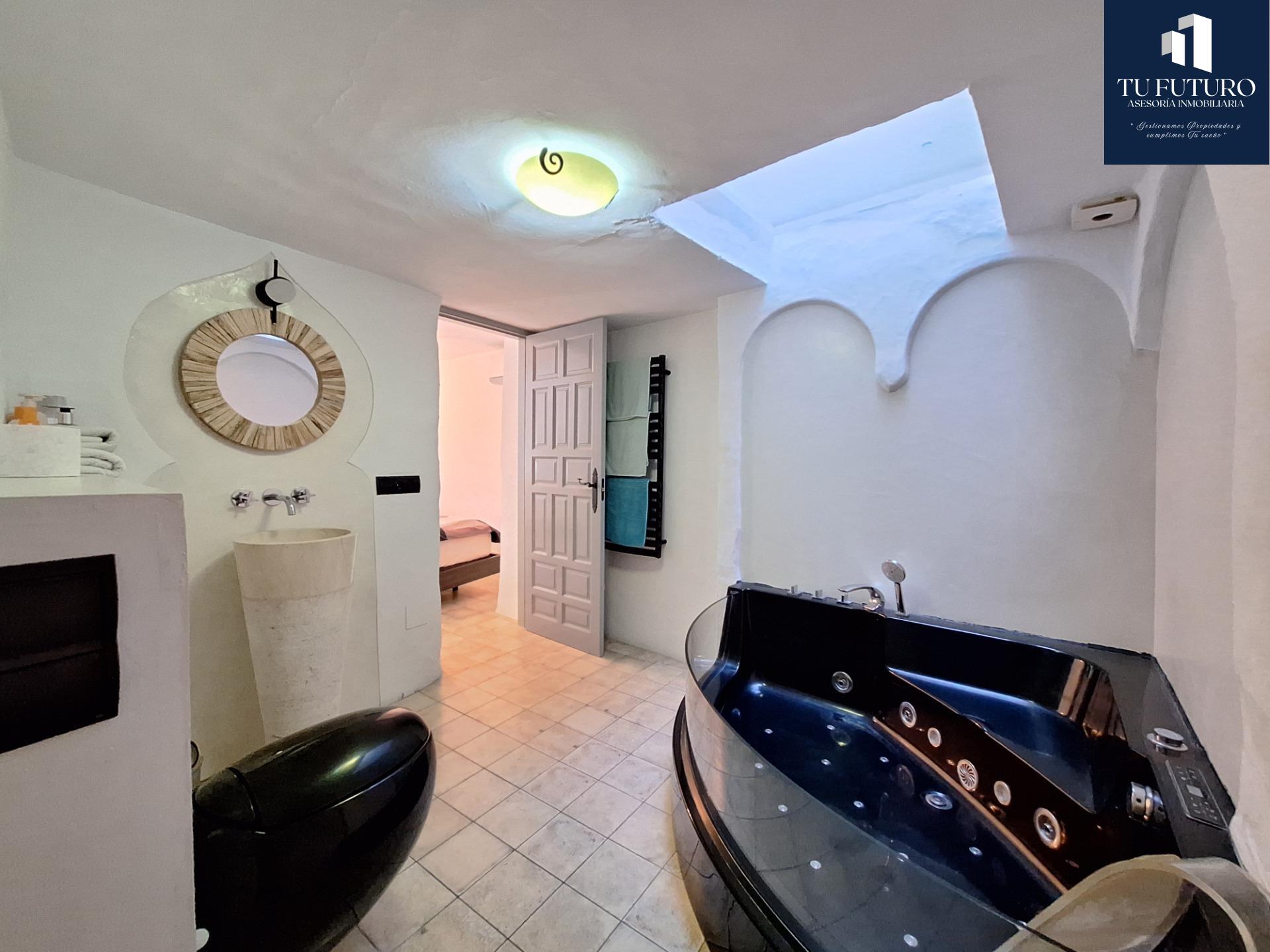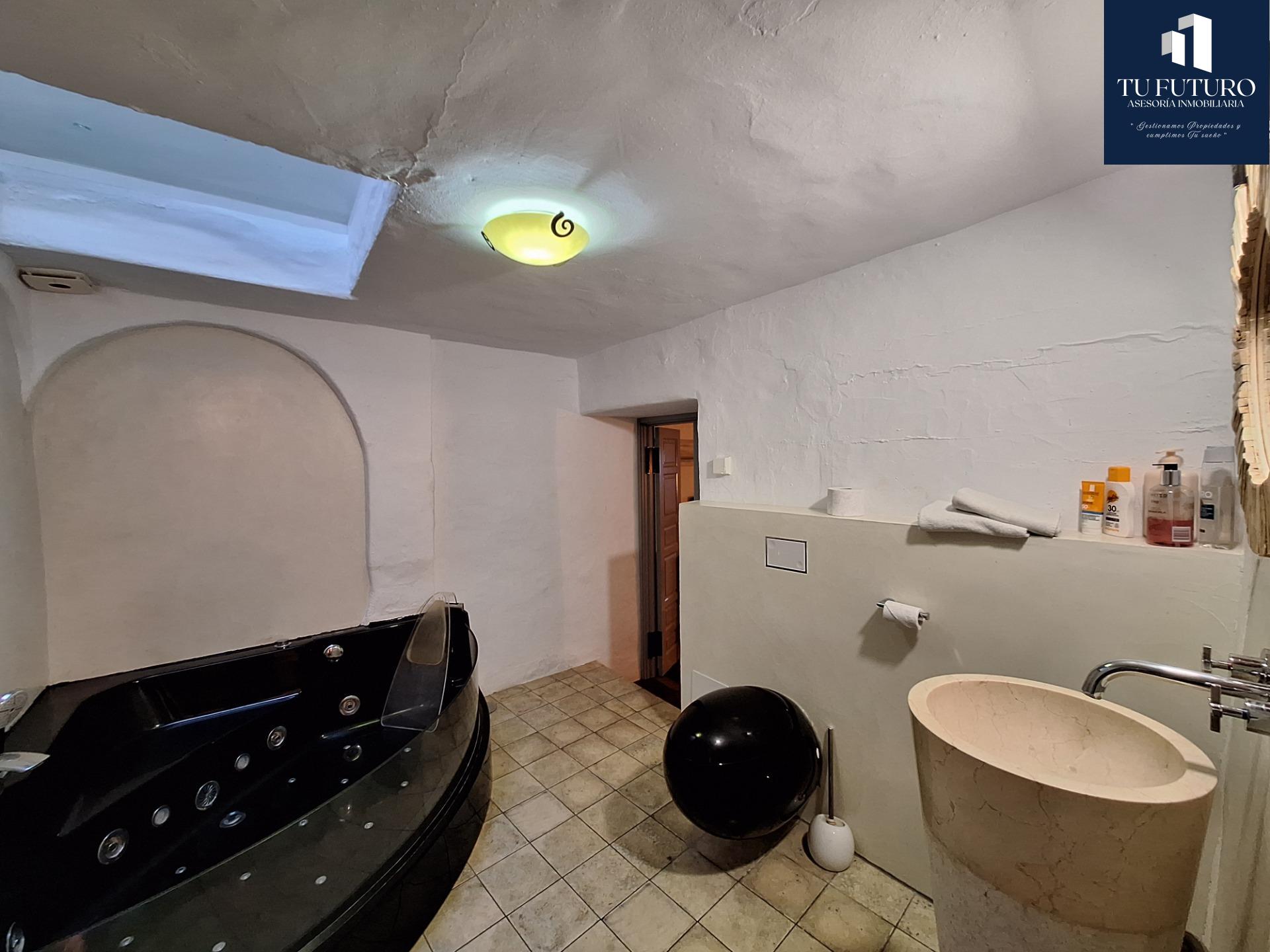 En esta misma planta, al subir dos simples escalones, nos presenta un baño principal con bañera de hidromasaje, inodoro moderno y por el que se accede a una habitación cueva muy original.