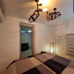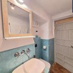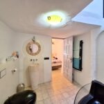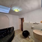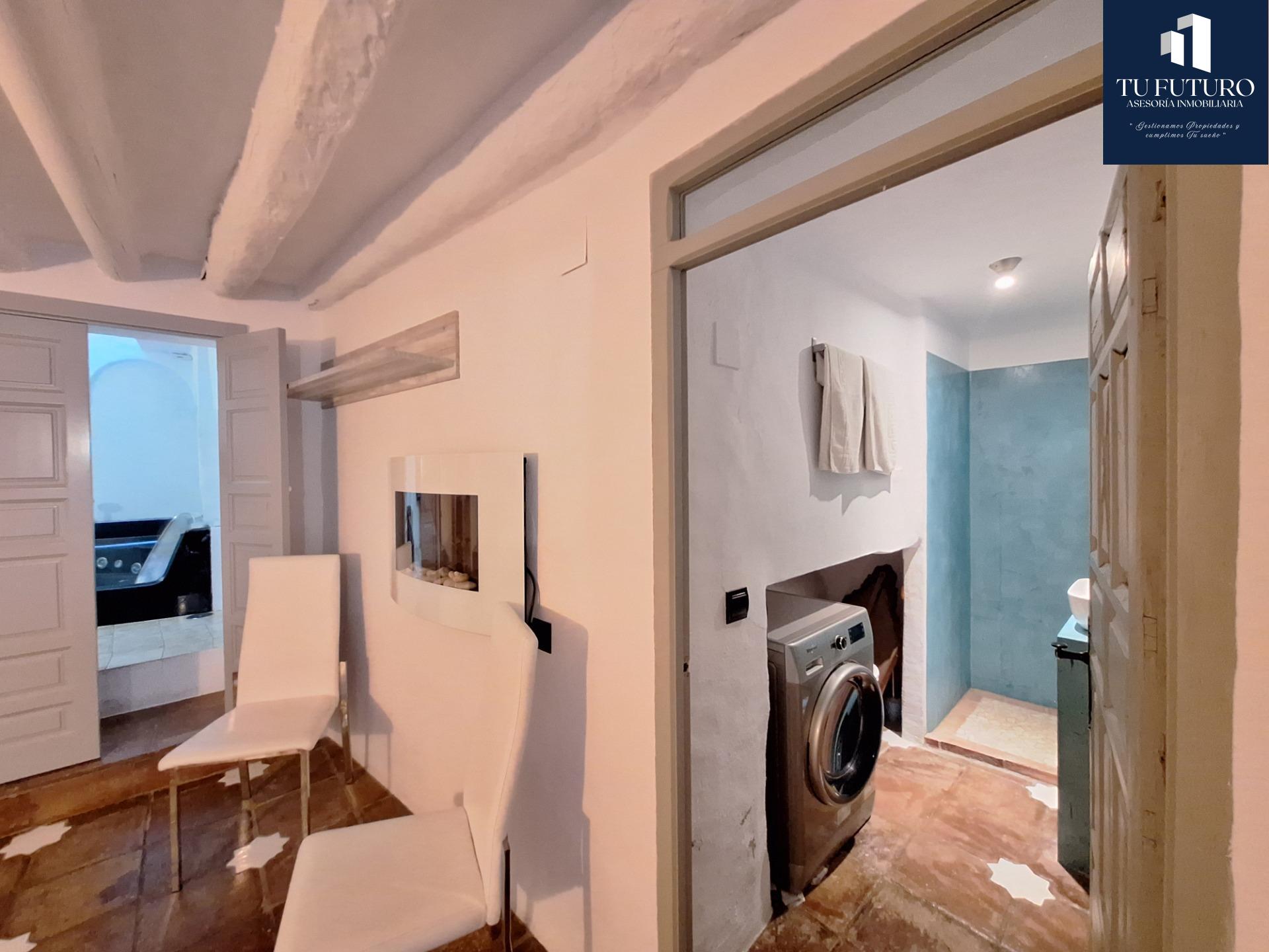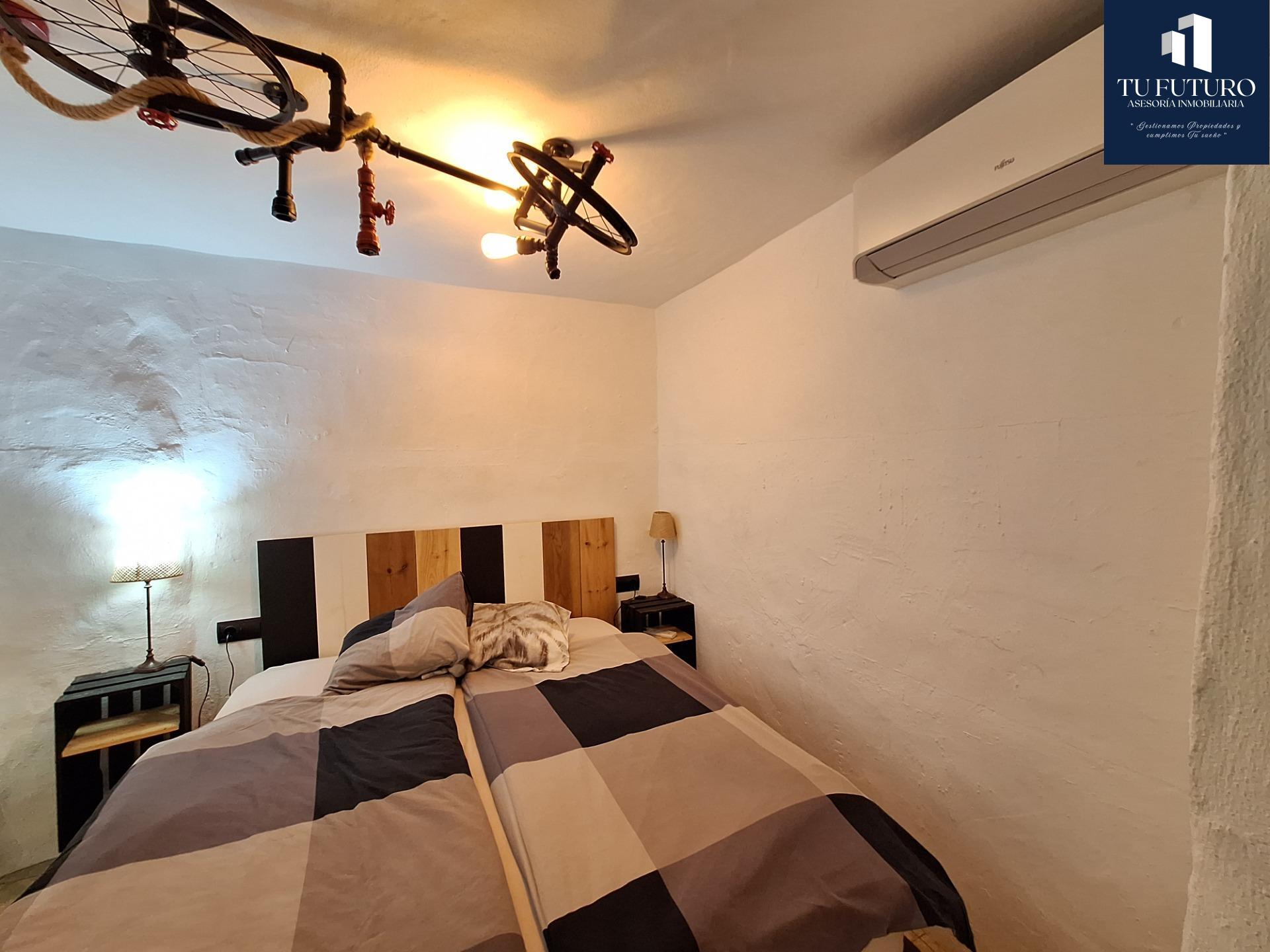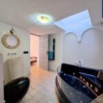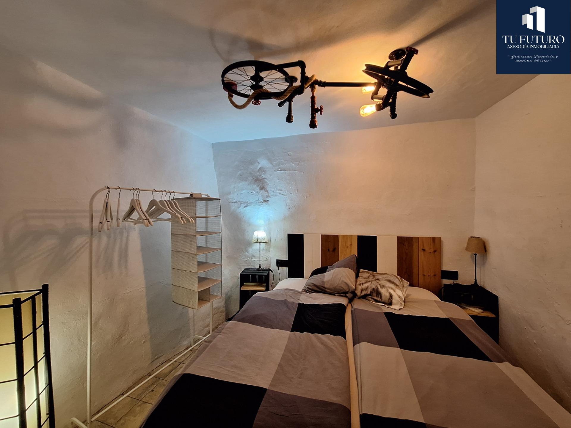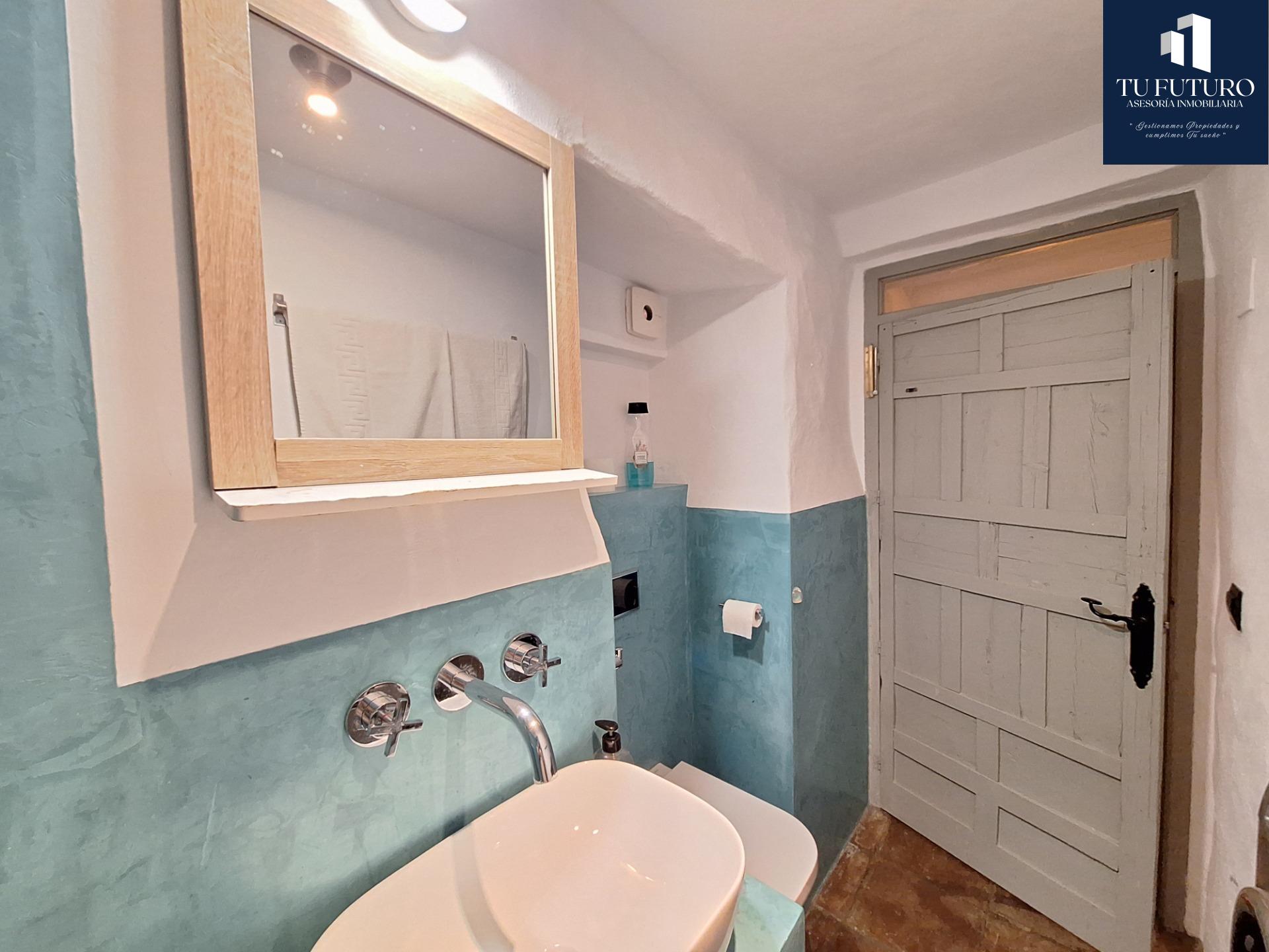 En esta misma planta, al subir dos simples escalones, nos presenta un baño principal con bañera de hidromasaje, inodoro moderno y por el que se accede a una habitación cueva muy original.
